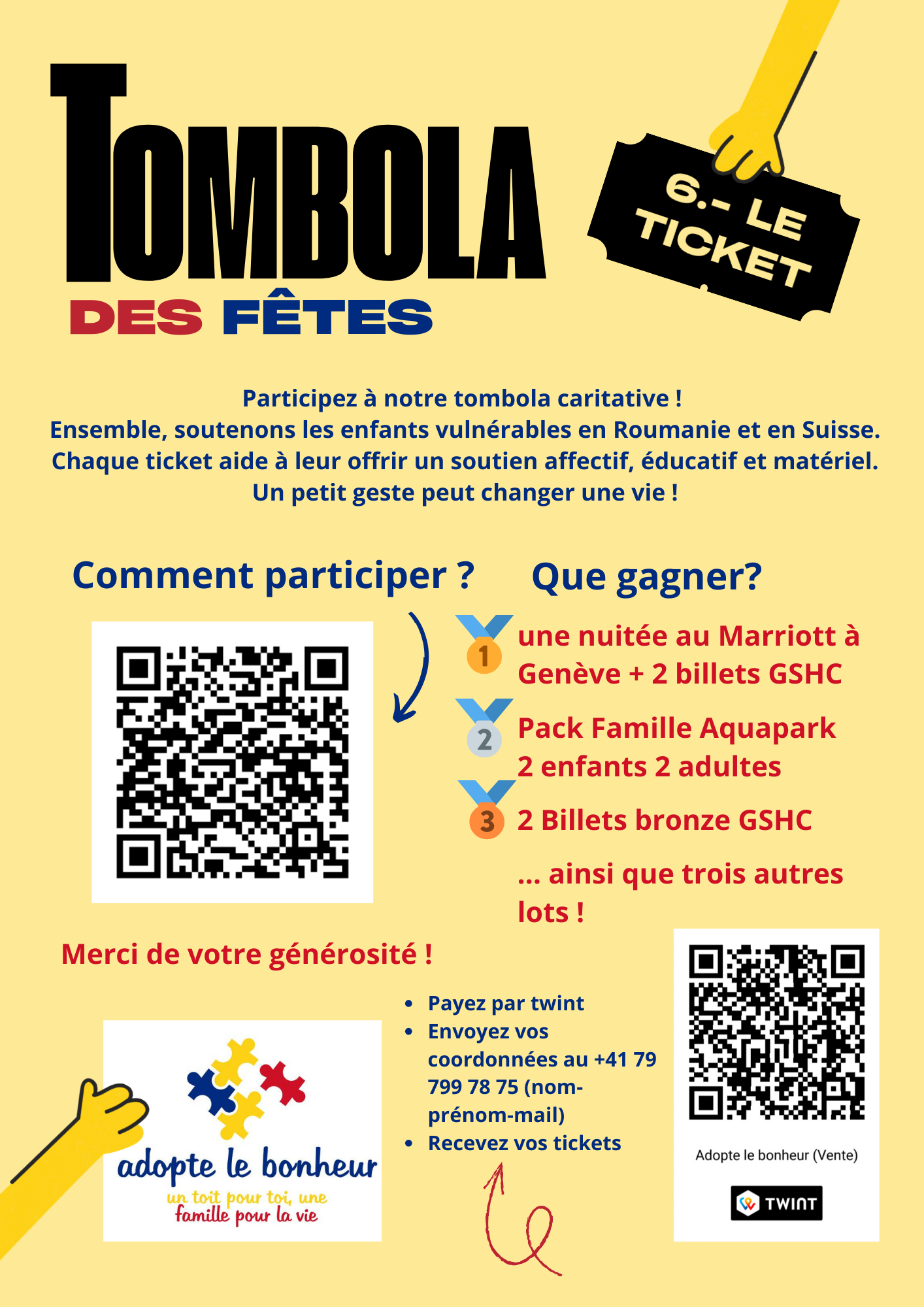 Association Adopte le bonheur Route Du Centre 36, Cottens, SwitzerlandPour célébrer la magie des fêtes et soutenir nos actions solidaires, l’Association Adopte le Bonheur organise sa grande Tombola des Fêtes 2025 ! En participant, vous contribuez directement à nos projets en faveur des personnes vulnérables, tout en ayant la chance de remporter de superbes lots.Merci de votre soutien et bonne chance à toutes et […]